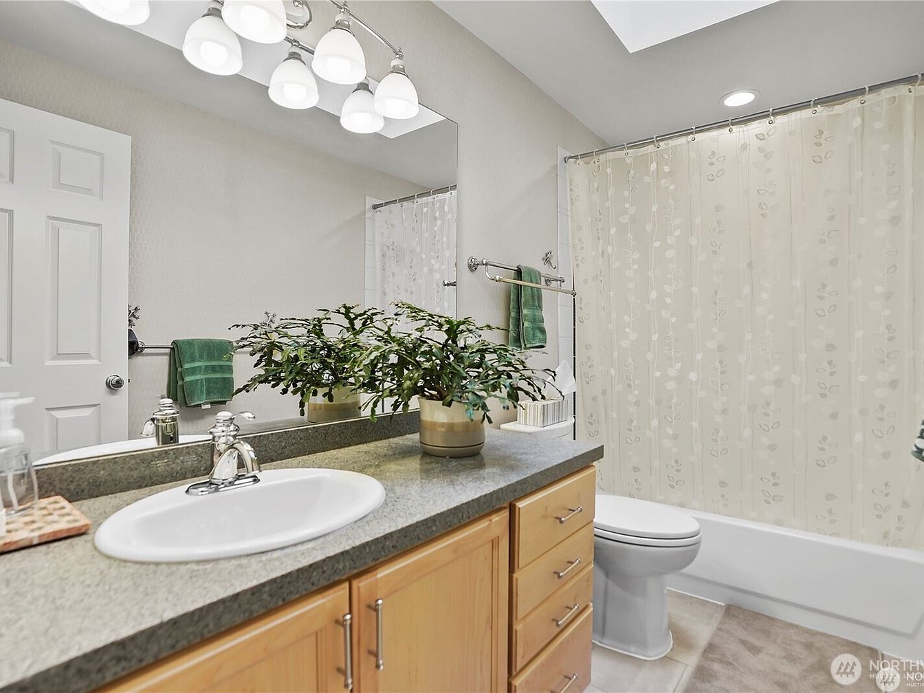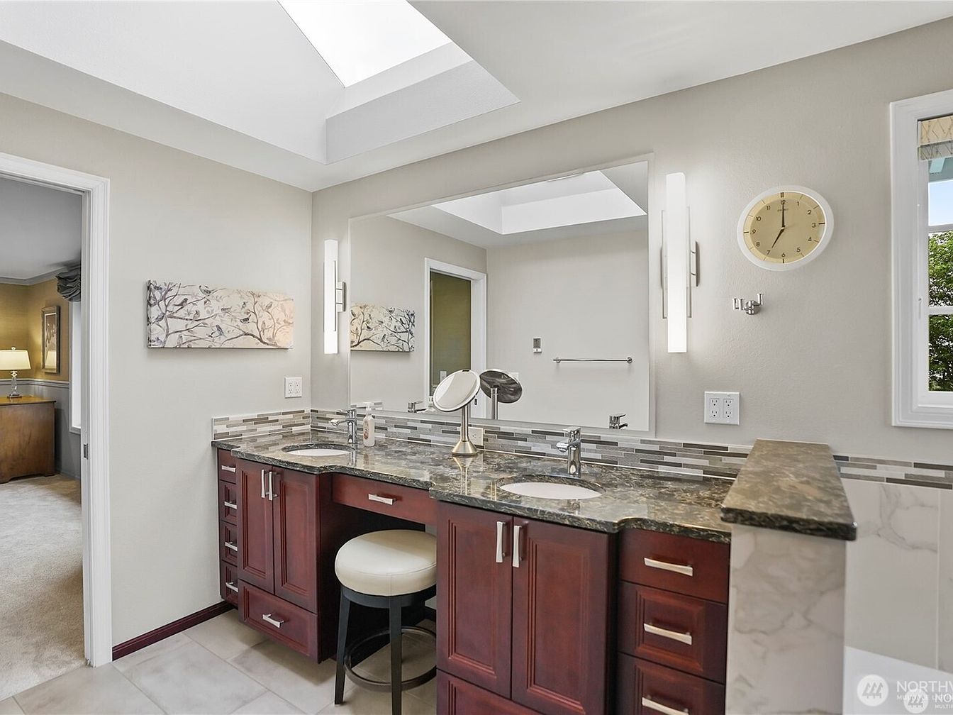 This bathroom features a spacious double vanity with rich, dark wood cabinetry contrasted by a polished stone countertop in varying earth tones. Underneath, a cushioned, cream-colored stool offers a comfortable spot for seating. The large mirror spans the entire vanity width, flanked by modern vertical light fixtures that provide ample illumination. Neutral wall paint complements the beige tile flooring and a subtle, decorative backsplash with horizontal mosaic tiles adds a refined accent behind the sinks. A skylight above floods the space with natural light, enhancing the room’s bright, elegant, and welcoming atmosphere.