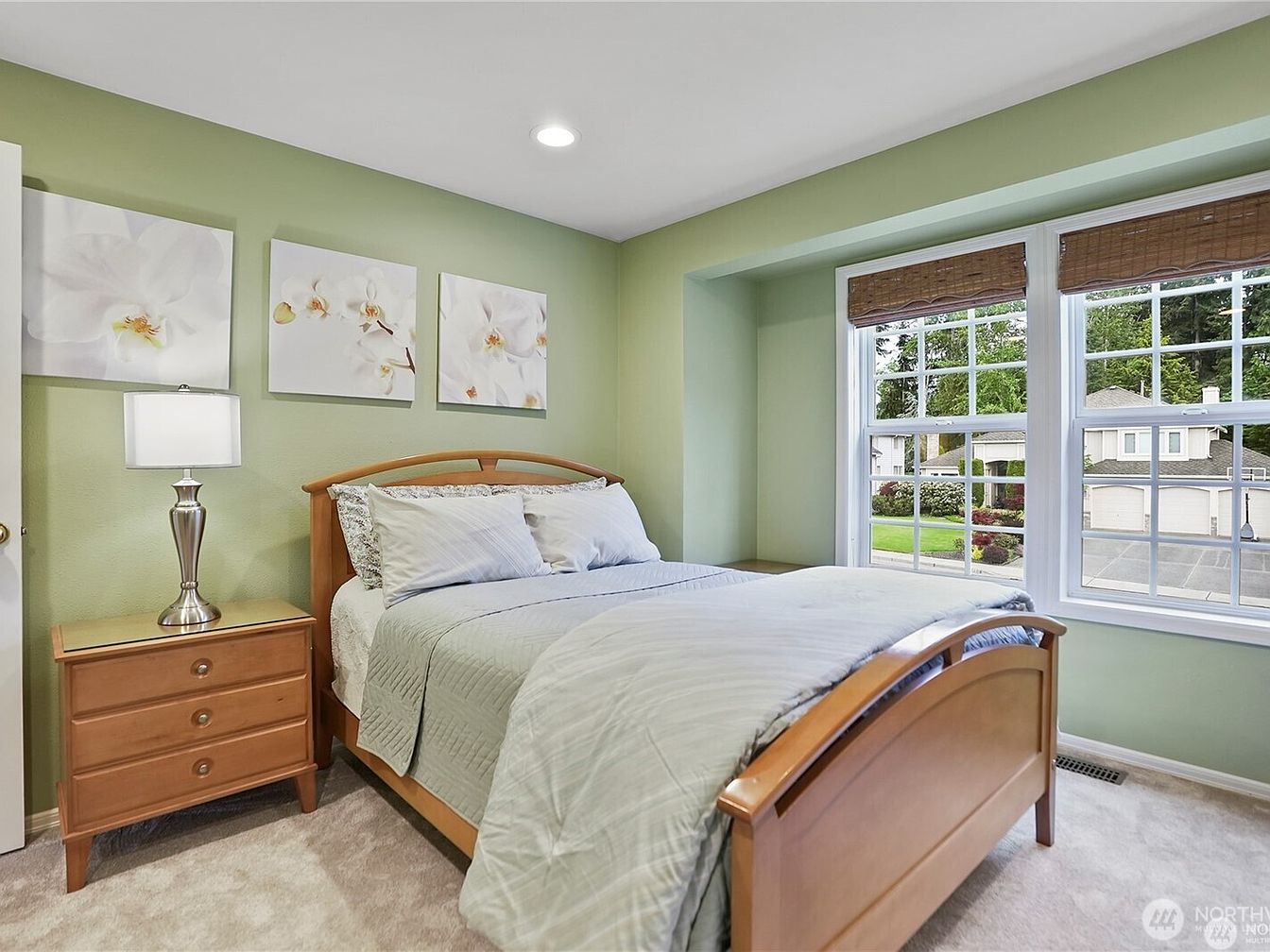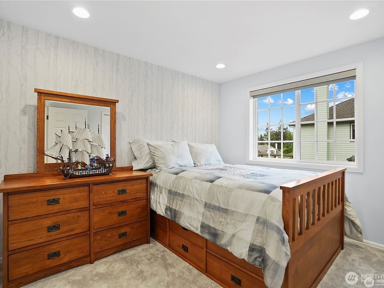 This compact bedroom features a warm wooden bed frame with built-in storage drawers beneath, paired with a matching dresser topped by a mirror. The bed is dressed in a soft, neutral-toned comforter with subtle stripes, complementing the calm color palette. A large window with white trim invites abundant natural light, offering a serene view of neighboring homes and greenery. The walls showcase a textured wallpaper with a delicate tree branch pattern, enhancing the room’s tranquil ambiance. Recessed ceiling lights add modern brightness, while plush carpeting underfoot adds warmth and comfort to the space.