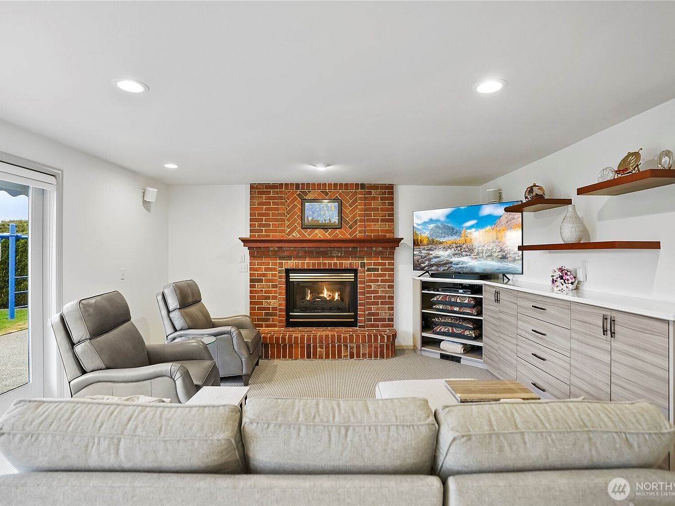 This cozy living room centers around a classic brick fireplace with a wooden mantel, offering a warm focal point. Positioned efficiently around the fireplace are two stylish gray recliner chairs, paired with a comfortable light beige sofa in the foreground, creating an inviting seating area. The room is illuminated by recessed white ceiling lights, enhancing the clean, neutral palette of white walls and soft carpeting. Against one wall, a long, light wood cabinet with ample drawer and cupboard space adds practical storage, while floating wooden shelves above display decorative accents. A large flat-screen TV sits neatly in the corner, balancing relaxation with entertainment. Sliding glass doors on the left invite in natural light and provide a view of the outdoor space.