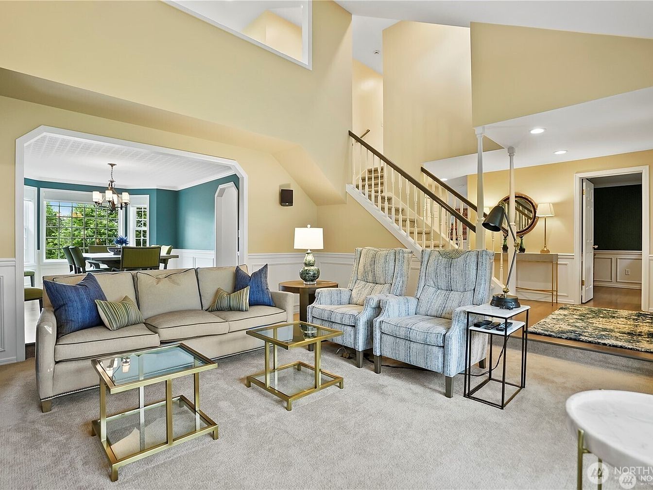 This inviting living room features a soft beige carpet that complements the light tan walls, creating a warm and cozy atmosphere. The seating arrangement consists of a neutral beige sofa adorned with blue and striped throw pillows, paired with two comfortable, patterned armchairs. Two glass-topped coffee tables with brass frames add a touch of elegance and openness. Architectural details include white wainscoting along the lower walls and a large, open archway leading into a teal-accented dining room, offering a visual contrast. A white staircase with wooden banisters ascends nearby, and subtle lighting from table lamps and recessed ceiling lights enhances the room’s ambiance.