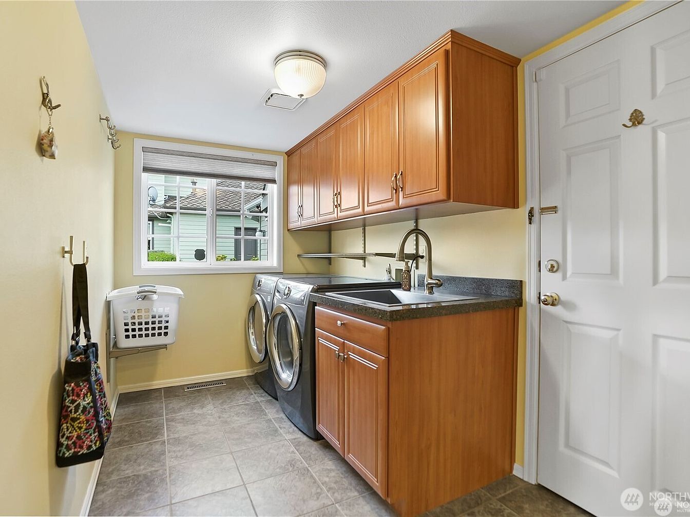 This laundry room is efficiently laid out with side-by-side front-loading washer and dryer units in sleek metallic finishes. Above the machines, warm wood cabinetry provides ample storage, extending across the length of the wall. A matching base cabinet supports a dark stone countertop that includes a modern sink with a stylish brushed nickel faucet, ideal for soaking or hand washing. The room’s color palette features soft yellow walls, creating a cheerful atmosphere, complemented by neutral gray floor tiles that are both practical and visually grounding. A large window allows natural light to fill the space, while hooks on the opposite wall add functional hanging options. A white door with traditional paneling completes the clean, inviting look.
