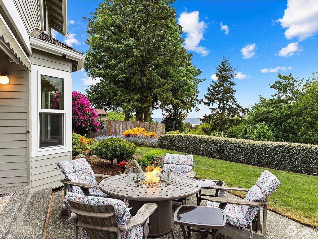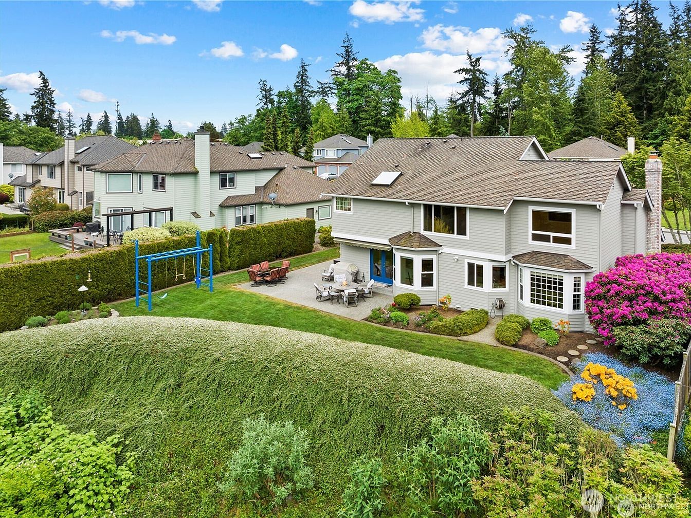 This spacious backyard features a neatly manicured lawn bordered by lush hedges that provide privacy and accentuate the greenery. The multi-level patio offers several seating zones, including a circular dining table with chairs and a cozy fire pit surrounded by Adirondack chairs, perfect for outdoor gatherings. The house’s light gray siding and brown shingle roof contrast elegantly with the vibrant flower beds showcasing bright pink, yellow, and blue blooms. A blue swing set adds a family-friendly touch. Large windows and a bay window allow ample natural light into the interior, melding outdoor charm with indoor comfort.