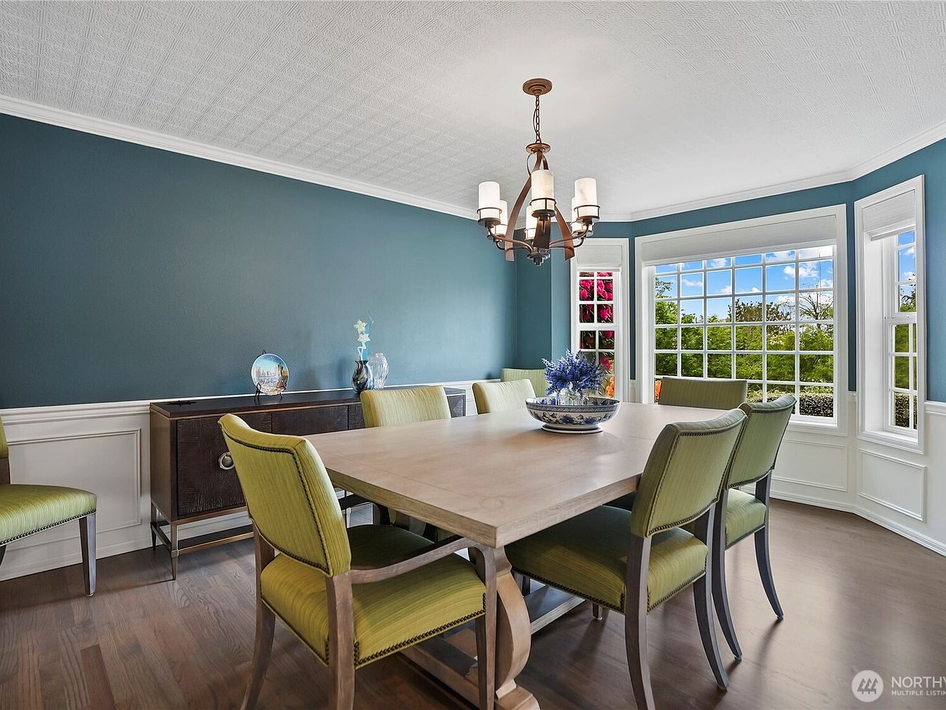 This elegant dining room features deep teal walls contrasted by crisp white wainscoting and trim, creating a sophisticated color palette. A large bay window fills the space with natural light, offering lush views of greenery outside. The room centers around a substantial rectangular wooden dining table with a smooth, natural finish. Surrounding it are six green upholstered chairs with refined nailhead trim, blending comfort and style. Above hangs a bronze, traditional chandelier with white frosted glass shades, adding a warm ambiance. A dark wood sideboard against one wall provides both storage and decorative surface space, highlighting tasteful simplicity in design.