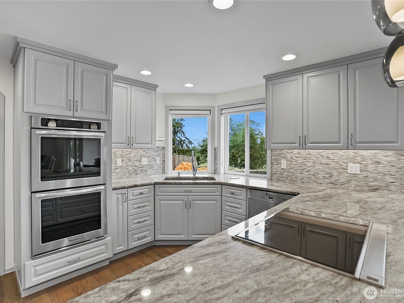 This kitchen features a sleek, modern design with a soft gray color palette dominating the cabinetry, complemented by stainless steel appliances including a double wall oven and a built-in dishwasher. The countertops are a polished granite with subtle veining that adds texture without overpowering the space. A mosaic tile backsplash in neutral tones adds visual interest and blends seamlessly with the cabinetry while enhancing the clean lines. The corner layout maximizes natural light coming through the large bay windows above the sink, offering serene outdoor views and creating a bright, inviting space for cooking and gathering. Recessed ceiling lights ensure ample illumination, and the overall look balances functionality with contemporary elegance.