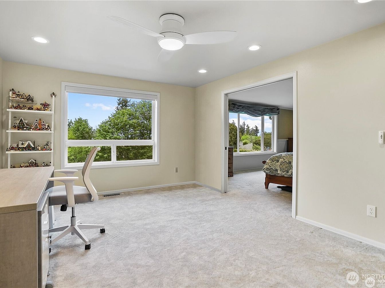 This cozy office nook embraces simplicity with a neutral palette of soft beige walls and plush light gray carpeting, creating a calm and inviting workspace. A large window floods the room with natural light while framing verdant outdoor views, enhancing the serene atmosphere. The minimalist desk and ergonomic white chair set up a practical work area, complemented by a dedicated shelving unit displaying miniature decorative houses that add a touch of personality. A modern ceiling fan with integrated lighting keeps the space well-ventilated and bright. An open doorway leads to a bedroom, continuing the clean and airy feel of the home.