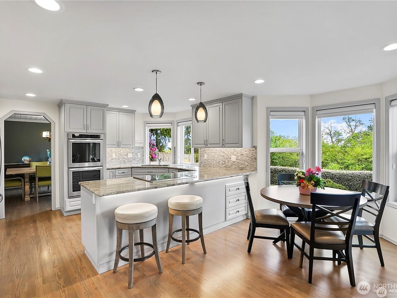 This open-concept kitchen features a clean and bright design with light gray cabinetry and neutral stone countertops. The kitchen island includes an induction cooktop and two cushioned bar stools, creating a casual dining or gathering spot. Pendant lights hang above the island, adding modern elegance and focused illumination. The backsplash uses a subtle mosaic tile that complements the overall muted color palette. Adjacent to the kitchen is a cozy breakfast nook with a round wooden table and four black chairs with cushioned seats. Large windows surround the nook, providing ample natural light and views of lush greenery outside. Warm wood flooring unifies the space, enhancing a welcoming atmosphere. An archway leads to a dining room, suggesting seamless flow between dining areas.