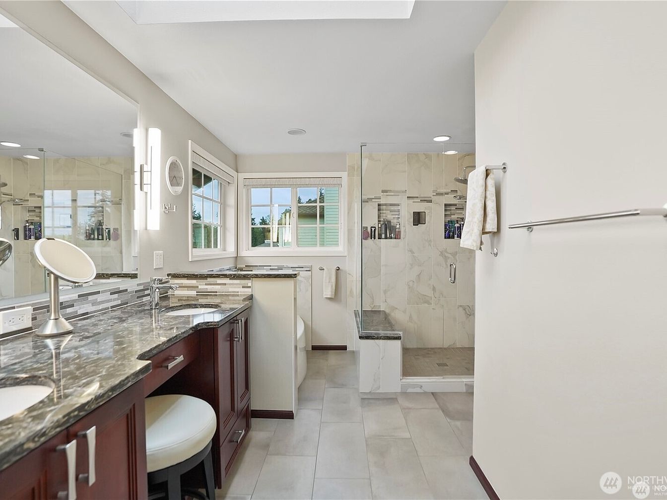 This elegant bathroom features a dual-sink vanity with dark wood cabinetry contrasted against a polished, marble-effect countertop. A built-in makeup stool fits neatly under the counter, enhancing functionality. The sleek vanity backsplash incorporates a modern mosaic tile pattern that complements the larger neutral floor tiles. Natural light floods in through two large windows with white trim, brightening the space alongside recessed lighting and wall-mounted fixtures. The walk-in shower showcases large, light marble tiles with a built-in niche adorned by accent mosaic tiles, enclosed in clear glass with a bench for added comfort. The overall design balances warmth and contemporary style.