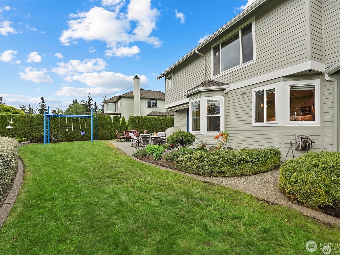 This backyard features a well-maintained expansive lawn bordered by neatly trimmed hedges and shrubs, providing privacy and a green, refreshing backdrop. A curved concrete pathway outlines the garden beds filled with flowering plants and bushes, adding color and texture to the space. The patio area includes outdoor dining furniture arranged around a fire pit, ideal for family gatherings and relaxation. The house exterior showcases light gray siding with white trim around the windows, complemented by a bay window that adds architectural interest. A bright blue children’s swing set stands on the lawn, emphasizing a family-friendly environment.