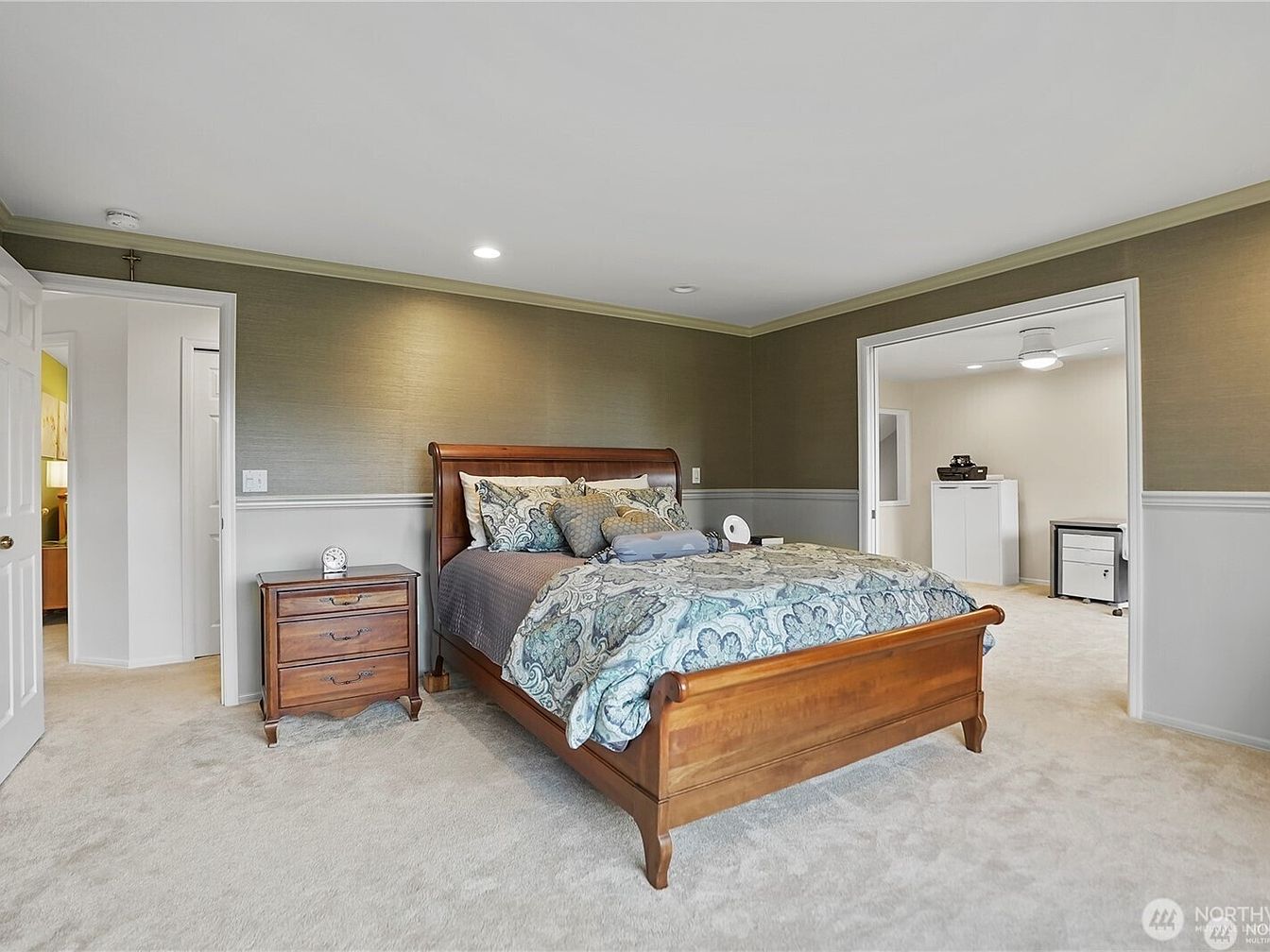 The master bedroom features a warm, inviting atmosphere with a classic wooden sleigh bed adorned with a patterned comforter in muted blues and greys. The walls have a sophisticated texture with an olive-green upper half contrasted by white wainscoting below, creating depth and elegance. Plush beige carpeting extends throughout, adding comfort underfoot. A matching wooden nightstand with three drawers sits to the left of the bed, holding a small clock. Two wide doorways provide access to adjacent spaces: one leading into a well-lit room with light neutral walls and white cabinetry, ideal for a sitting area or office. The ceiling is plain white with recessed lighting, offering a calm and uncluttered ambiance.