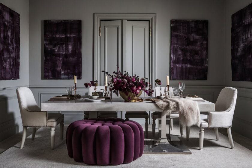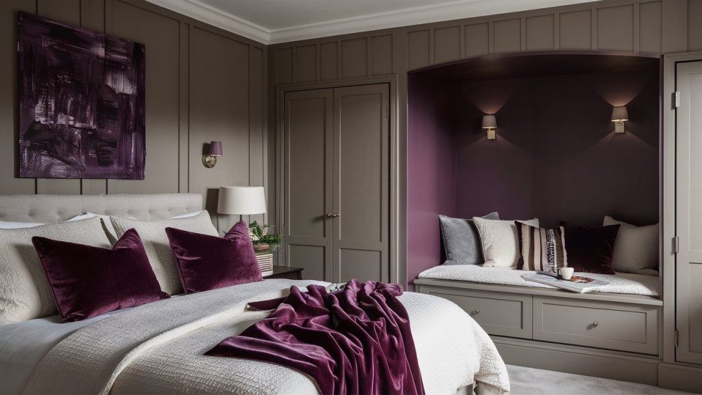 Moody aubergine—an elegant deep purple with warm undertones—brings richness and drama to neutral interiors. Use it for velvet throw pillows, abstract art, or even a painted alcove to create depth. It complements taupe, ivory, and charcoal effortlessly, adding a touch of sophistication while maintaining a balanced, understated elegance. Aubergine feels both cozy and upscale, making it ideal for intimate spaces like bedrooms, dens, or reading nooks.