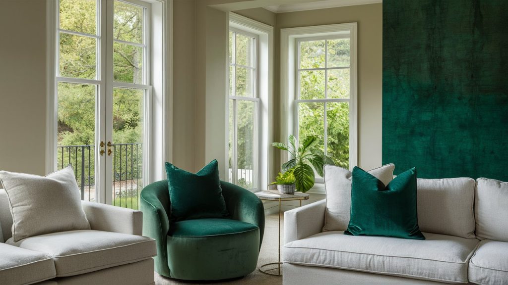 Emerald green adds a rich, organic sophistication to any neutral room. It pairs effortlessly with soft whites, beiges, and grays, offering a bold contrast that doesn’t feel overpowering.You can introduce it through accent chairs, plush velvet cushions, or even by creating a striking feature wall. Emerald’s lush undertone connects the indoors with nature and evokes a feeling of balance and serenity. It’s especially effective in living rooms or bedrooms where you want a cozy yet refined look.