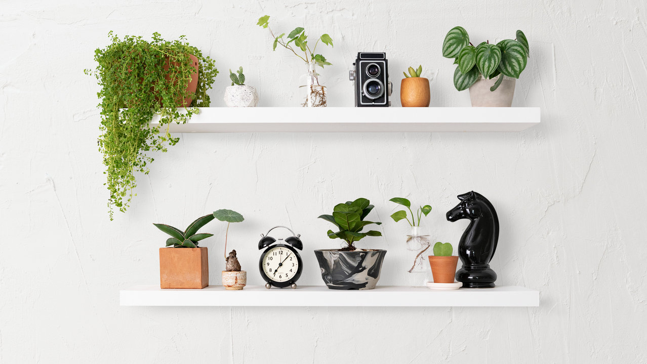 Layered wall shelving adds both functionality and elegance to a space by offering a structured way to display decorative pieces, plants, and personal items. The arrangement of shelves at different heights creates visual interest while keeping surfaces clutter-free. Incorporating a mix of natural elements like potted plants, ceramics, and minimalistic accessories enhances the modern aesthetic, making the design feel both stylish and inviting. Whether in a living room, office, or kitchen, floating shelves maximize storage while maintaining an airy, open feel.