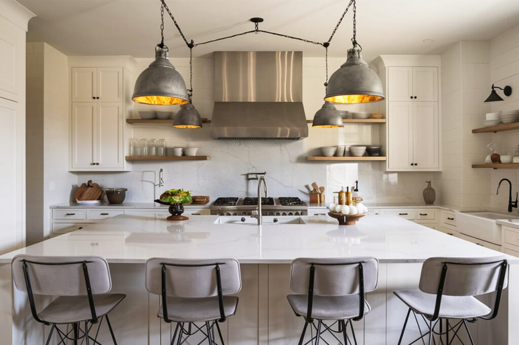 The kitchen serves as the heart of a modern farmhouse, often featuring a spacious island as its focal point. These oversized islands provide ample workspace, additional seating, and a place for gatherings. Materials like butcher block, quartz, or honed marble add texture and durability, while farmhouse sinks and shaker-style cabinetry reinforce the home’s timeless appeal. Open shelving, often made of reclaimed wood, keeps essentials accessible while adding rustic character. Paired with industrial pendant lights and black or brass hardware, the modern farmhouse kitchen blends practicality with effortless style.