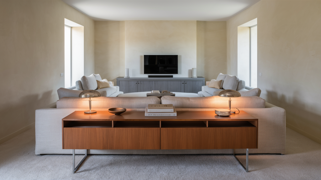 If you float your sofa in the middle of the room, a slim console table placed behind it can add function and polish. It’s a great spot for lamps, books, or decorative objects and helps define the living area without adding bulk. Look for a table that mirrors the length of your sofa and stays within a narrow depth. This small addition adds dimension and provides storage or display space without closing off the room.