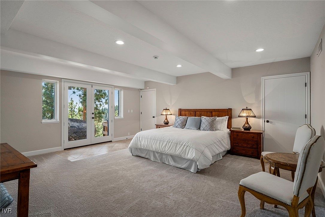 This expansive master bedroom exudes calm and comfort, with a soothing neutral color scheme. A queen-size bed dressed in white linens and decorative pillows serves as the centerpiece, while double doors open to an outdoor space letting in natural light. Exposed beams on the ceiling add architectural interest, and bedside lamps offer a warm glow. Plush carpeting, a cozy chair, and a compact reading nook complete this inviting sanctuary.