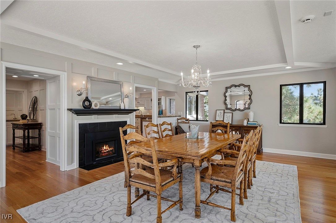 This inviting dining area centers around a substantial wooden table surrounded by eight rustic chairs. Rich oak floors complement beige walls, with a subtle area rug adding texture beneath the table. A grand crystal chandelier serves as a focal point, while the corner fireplace clad in dark stone enhances the cozy atmosphere, making it a perfect spot for winter gatherings. Large windows invite natural light and showcase the surrounding scenery.