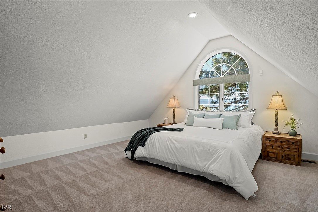 This inviting secondary bedroom showcases a dramatic sloped ceiling that amplifies the sense of space. Soft neutrals, beige carpeting, and white bedding create a calm backdrop, accented by aqua pillows. Warm lighting from bedside lamps and a large rounded window flood the room with natural light, framed by a tasteful valance. The design blends comfort with style, delivering a relaxing haven for family or guests.