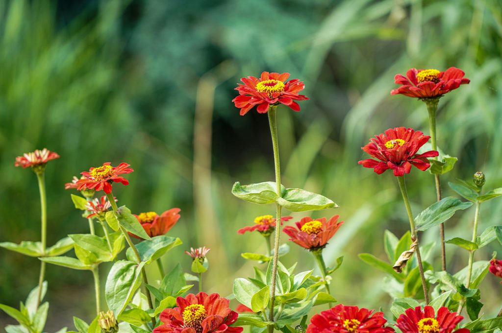 Zinnias are long-blooming flowers that bring an explosion of color to any garden. Their vibrant orange blooms, which come in a variety of shapes and sizes, are perfect for filling garden beds, borders, or containers. Zinnias are easy to grow, requiring full sun and well-drained soil, and they thrive in the warmth of summer. Known for their resilience, these flowers bloom from early summer to the first frost, attracting pollinators like bees and butterflies, making them a garden favorite for lasting color.
