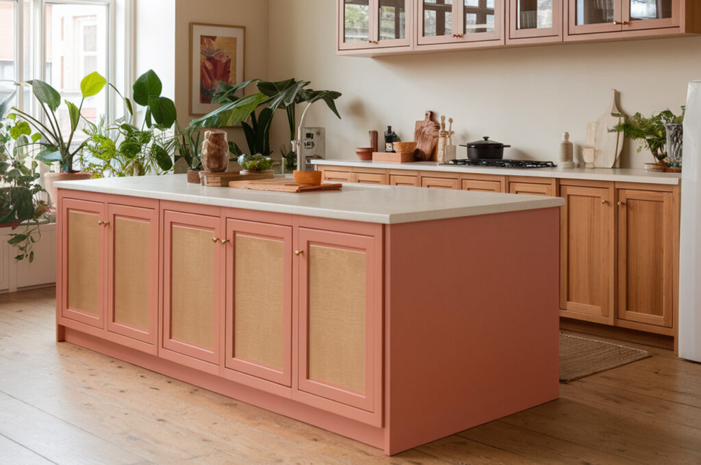Muted coral is a fresh and unexpected choice that infuses a kitchen with warmth and personality. This subtle pink-orange hue brings energy without overwhelming the space, making it an ideal option for coastal, bohemian, or eclectic kitchens. Coral pairs beautifully with soft neutrals, warm woods, and even cool-toned grays, creating a balanced yet lively atmosphere. To enhance its charm, consider open shelving with natural elements like woven baskets or ceramic dishware.