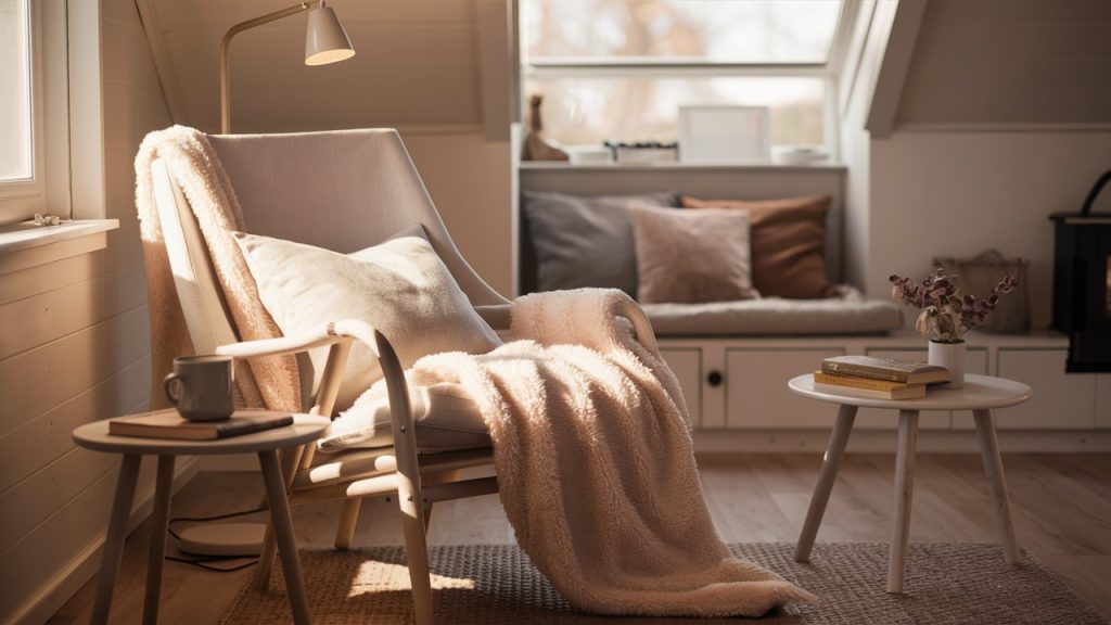 Every small home benefits from a cozy corner dedicated to relaxation. In true Scandinavian fashion, transform a sunny window or unused space into a reading nook with a comfy chair, soft blanket, and a side table. Add a lamp for evening light and keep accessories minimal. It doesn’t need to be large—a well-designed nook offers a peaceful retreat and reflects the Scandi value of slow living and mindful moments.