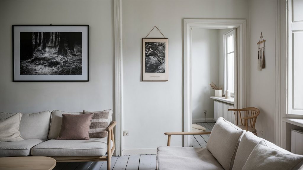 Scandi design favors quality over quantity, especially with wall art. Instead of overcrowding your walls, select one or two statement pieces that reflect your personality. Try black-and-white photography, abstract prints, or nature-inspired artwork in slim frames. Hang art at eye level and leave space around each piece to allow it to breathe. This approach adds visual interest without making your small space feel chaotic or over-decorated.