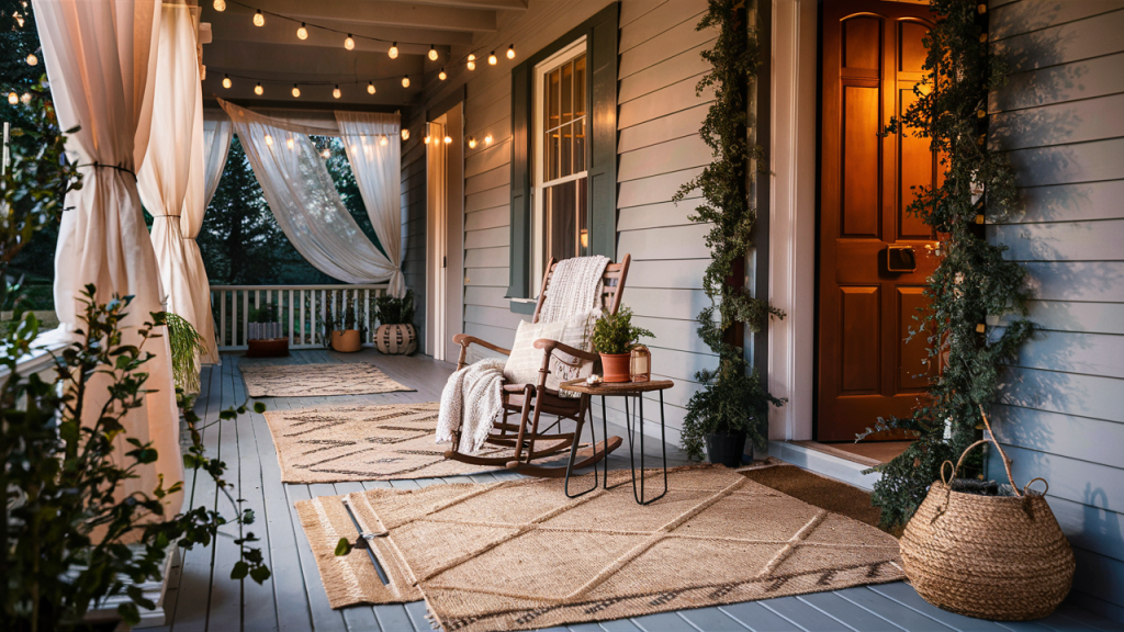 A well-chosen welcome mat is a small detail that makes a big impact. Choose a mat with a fun greeting, a classic monogram, or a seasonal design to reflect your style. Layering a patterned outdoor rug beneath it adds depth and warmth, making your porch feel more put together. Not only does a welcome mat enhance aesthetics, but it also helps keep dirt from tracking inside, making it a practical and stylish addition to your entryway.