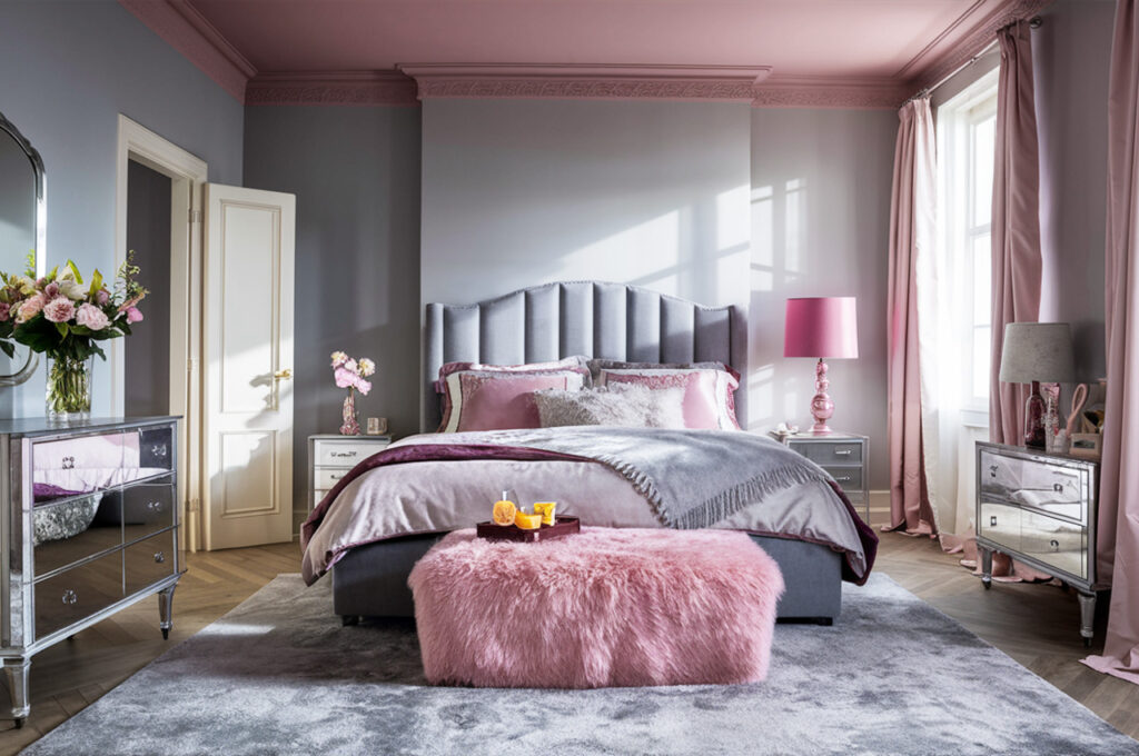 A blush pink ceiling paired with light gray walls creates a soft, romantic ambiance with a modern twist. The gentle pink adds warmth and sophistication without feeling overly feminine, while light gray balances the palette with a sleek, contemporary touch. This combination works beautifully in bedrooms, nurseries, or chic living spaces where a refined yet cozy feel is desired. To elevate the look, incorporate soft textiles like velvet curtains or a statement light fixture that enhances the subtle elegance of the painted ceiling.