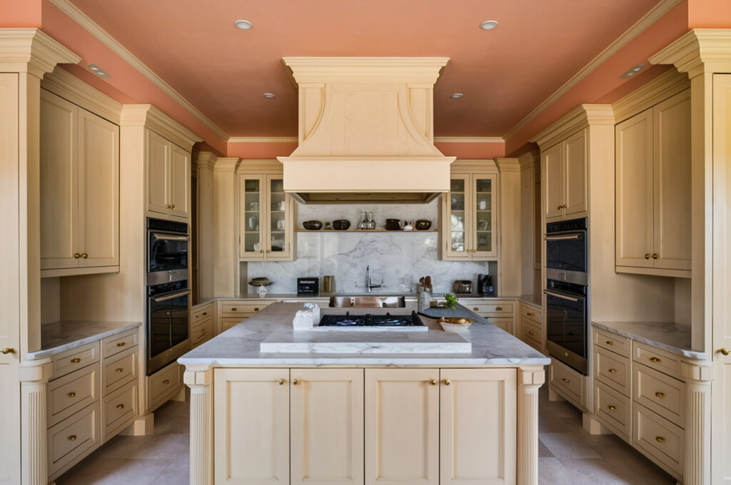 A soft peach ceiling against creamy walls brings warmth and charm to any space. This delicate color combination is perfect for creating a welcoming and uplifting ambiance in kitchens or sunlit living rooms. The warm undertones of peach brighten the ceiling, drawing attention upward, while cream walls maintain a timeless and refined look. To enhance the effect, use wood accents and soft gold fixtures for a cohesive, high-end feel. Consider adding a statement chandelier or pendant lights to further emphasize the ceiling’s inviting glow.