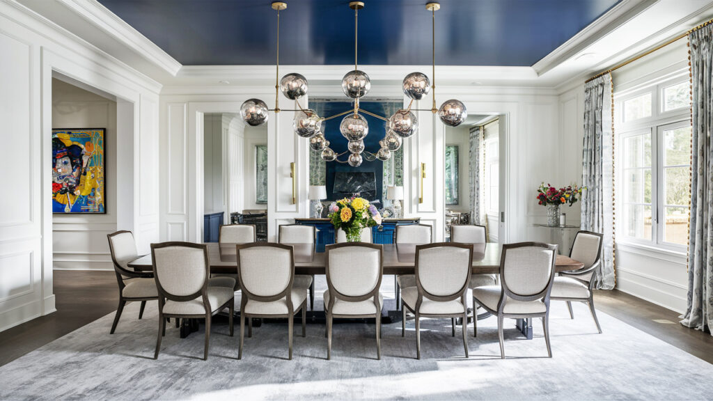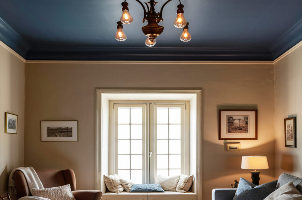 A navy blue ceiling with crisp white walls brings classic elegance to any space. The rich depth of navy adds a sophisticated touch, while the bright white walls keep the room feeling airy and fresh. This pairing is perfect for dining rooms or bedrooms, where the deep ceiling color creates a cozy yet stylish ambiance. Adding gold or brass light fixtures enhances the luxurious effect, making the ceiling the standout feature of the room. A glossy or subtle matte finish on the ceiling can further enhance its depth, creating a striking yet polished look.