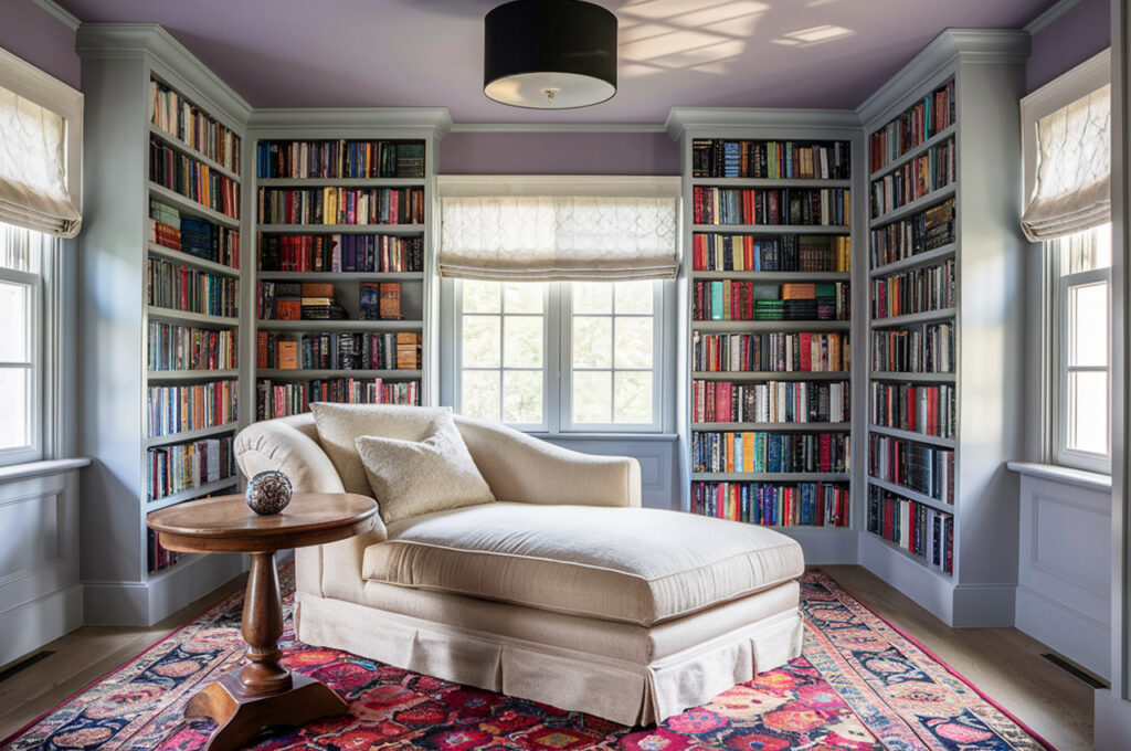 A muted lavender ceiling combined with light gray walls creates a soft and dreamy aesthetic. The lavender hue adds a subtle pop of color without feeling overpowering, while gray walls ground the design in sophistication. This combination works well in bedrooms and reading nooks, where the gentle ceiling color enhances relaxation. Soft lighting and white trim can further accentuate the ceiling, making the space feel effortlessly elegant. Layering different textures, like plush rugs or velvet cushions, can amplify the luxurious feel of the room.
