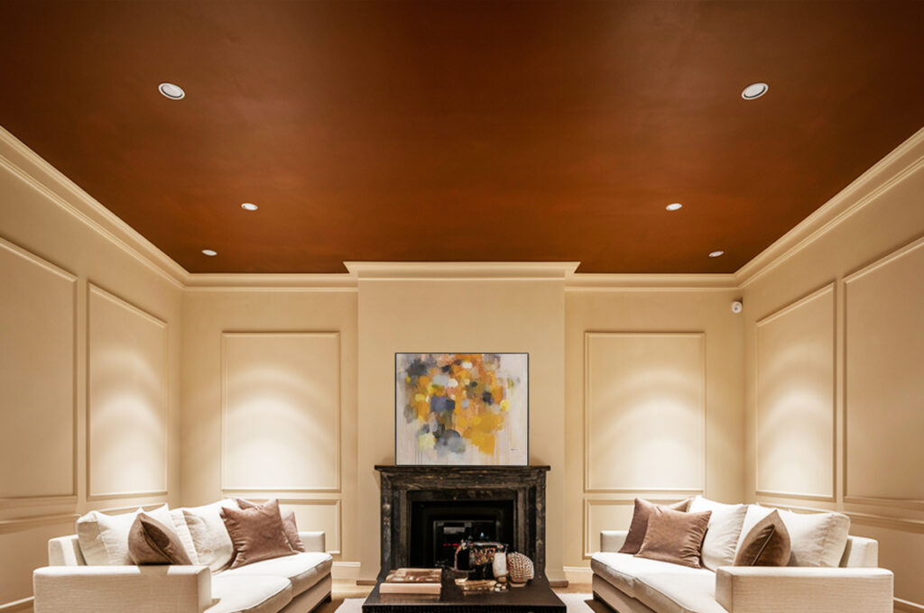 A warm terracotta ceiling set against creamy white walls exudes an earthy yet high-end aesthetic. This rich, sunbaked hue brings depth and coziness, making it an ideal choice for dining rooms or living rooms. The creamy white walls provide a neutral contrast, ensuring the ceiling remains the star of the space without overwhelming it. To complement the look, add rattan or wood elements, and use warm lighting to enhance the ceiling’s natural glow. This inviting color combination instantly makes a room feel well-curated and sophisticated.