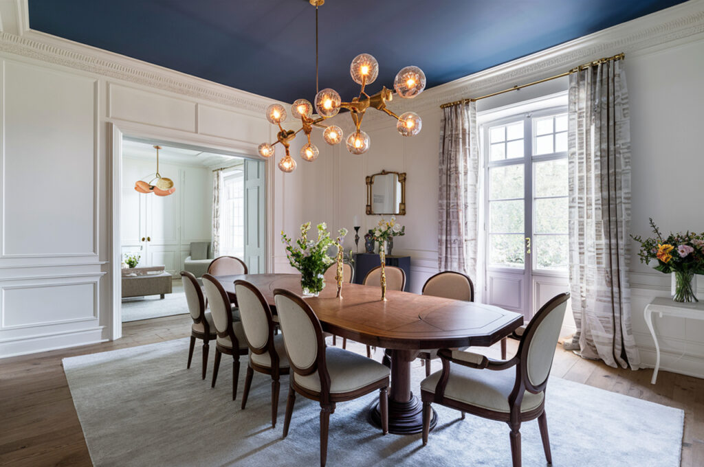 For an ultra-luxurious feel, a midnight blue ceiling with soft gold walls creates an opulent yet balanced contrast. The deep blue ceiling mimics the night sky, bringing an air of mystery and elegance, while the soft gold walls add a warm, luminous glow. This combination is perfect for a formal dining area or a stylish lounge, where a touch of grandeur is welcome. Metallic decor and dimmable lighting further enhance the rich ambiance, making the ceiling feel like a lavish statement piece.