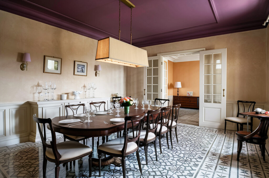 A plum purple ceiling against warm beige walls adds a regal yet welcoming touch to any space. The deep purple hue exudes drama and sophistication, while beige walls soften the contrast, ensuring a balanced and cozy feel. This combination is ideal for dining rooms, libraries, or even creative workspaces where a moody yet elegant atmosphere is desired. Complement the look with dark wood furniture, gold accents, and statement lighting that draws attention to the rich ceiling color.