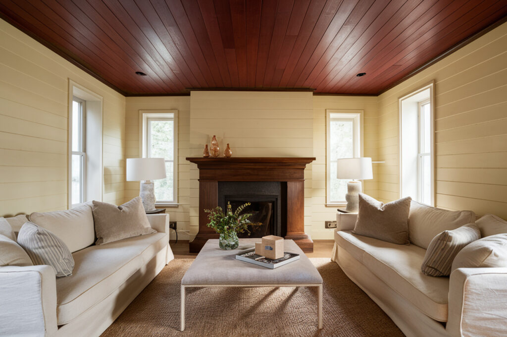 A mocha brown ceiling against cream walls delivers a rich, grounded look that feels effortlessly luxurious. The deep brown hue brings warmth and depth, making it an excellent choice for traditional living rooms or rustic-inspired bedrooms. The cream walls provide a light, neutral contrast that prevents the ceiling from feeling too heavy while enhancing the overall coziness of the space. Accentuate the look with bronze fixtures, textured fabrics, and dimmable lighting for a refined, high-end ambiance.