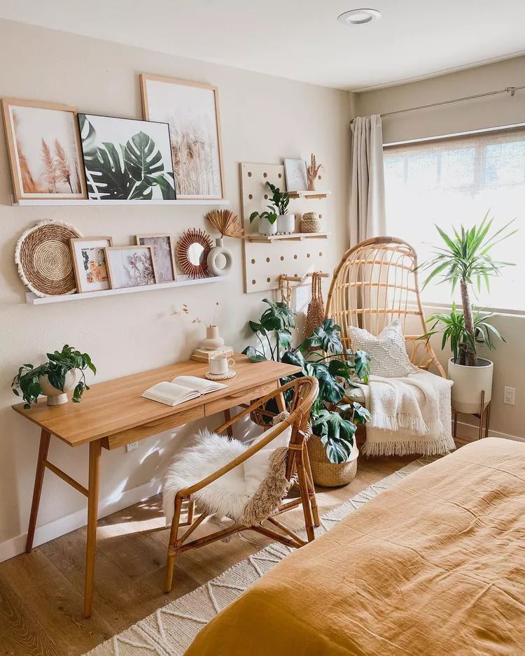 For those embracing simplicity in small spaces, a minimalist floating desk offers both style and function. Designed by Michelle Boudreau, this setup features a single wood surface that’s the perfect size for essentials—just a lamp, computer, and a small plant. The floating design keeps the space feeling open and uncluttered, making it ideal for work or study. This clean, modern approach transforms even the tiniest rooms into streamlined, efficient spaces without sacrificing design.