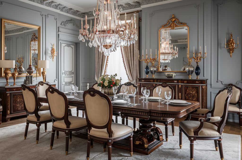Rich, dark wood furniture is a hallmark of Victorian design. Mahogany, walnut, and oak dining tables with carved legs and intricate detailing create an air of sophistication. Pair them with matching sideboards or display cabinets to showcase fine china and silverware. High-backed dining chairs with plush upholstery in velvet or brocade fabrics add to the traditional feel. A polished wood dining set instantly transports the room to another era while offering durability and classic appeal.