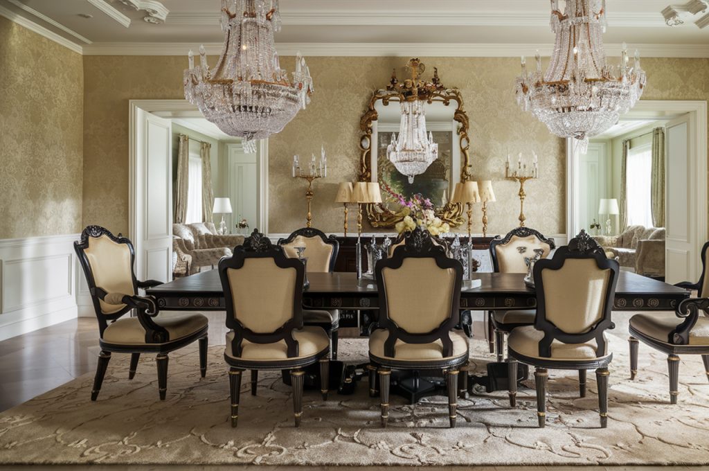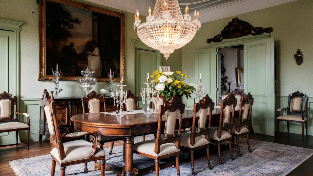 Lighting plays a key role in Victorian interiors, and nothing sets the tone like an opulent chandelier. Crystal-draped fixtures, antique brass designs, or candle-style chandeliers bring drama and sophistication to the dining space. Opt for a statement piece with intricate details, such as scrolling arms or etched glass, to channel the grandeur of the period. When combined with wall sconces or vintage-inspired pendant lights, a well-chosen chandelier enhances the room’s old-world charm while providing a warm, inviting glow.