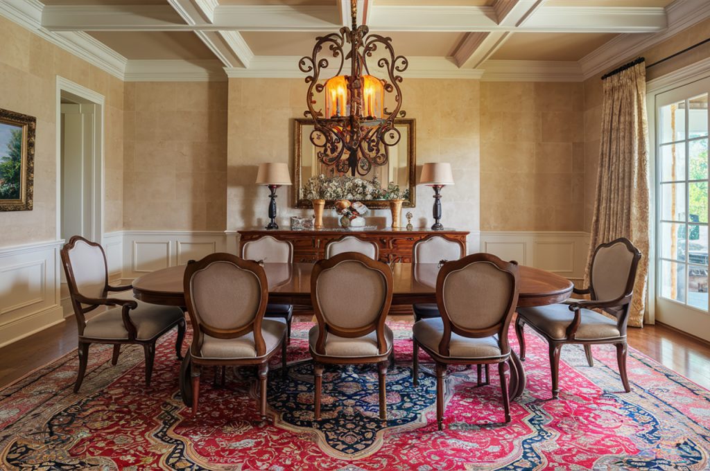 A Victorian dining room wouldn’t be complete without a richly patterned rug anchoring the space. Persian and Oriental rugs, with their intricate designs and deep, warm hues, add texture and color while complementing dark wood furniture. Opt for oversized rugs that extend beyond the dining table, ensuring chairs remain on the rug even when pulled out. The plush material helps absorb sound, creating a more intimate dining experience while reinforcing the room’s cozy, vintage appeal.