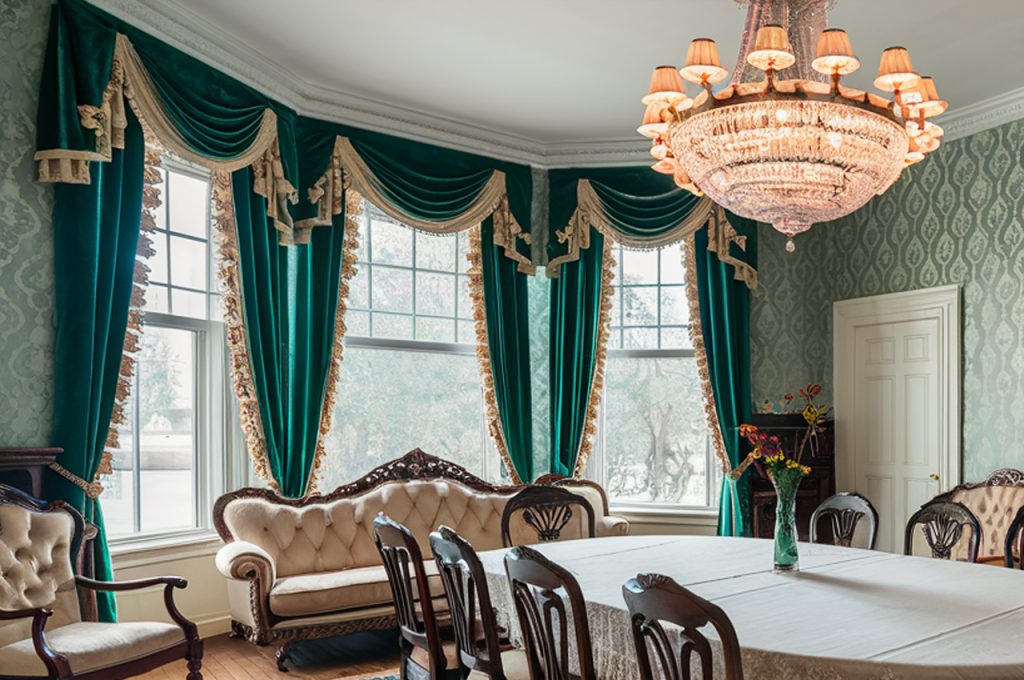 Victorian dining rooms often feature heavy, floor-length drapery that enhances the room’s regal aesthetic. Velvet, brocade, or damask curtains in rich hues like deep red, emerald green, or royal blue create a dramatic backdrop. Layering sheer lace panels beneath heavier drapes adds softness while allowing natural light to filter through. To complete the look, opt for decorative tiebacks, tassels, or gold-trimmed curtain rods, all of which bring an extra touch of elegance to the space.