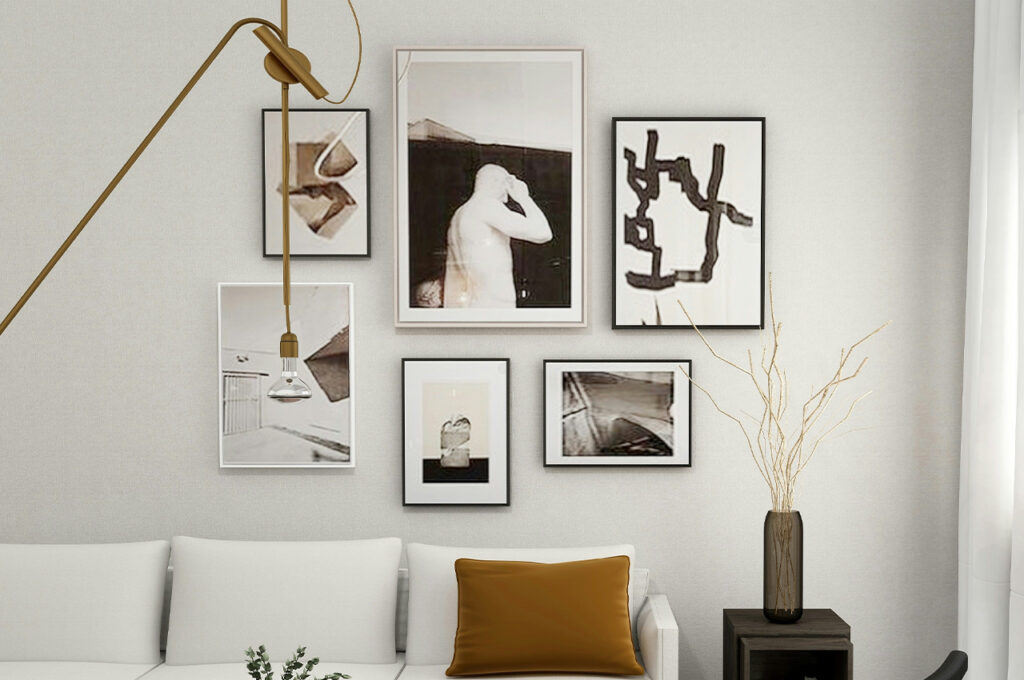 An asymmetrical cluster layout arranges different-sized artworks in a seemingly random yet well-balanced composition. This layout allows for creative freedom, mixing various frames, styles, and subject matter while maintaining visual harmony. Ideal for adding movement and personality to a space, an asymmetrical arrangement keeps the eye engaged without feeling too rigid or formulaic.