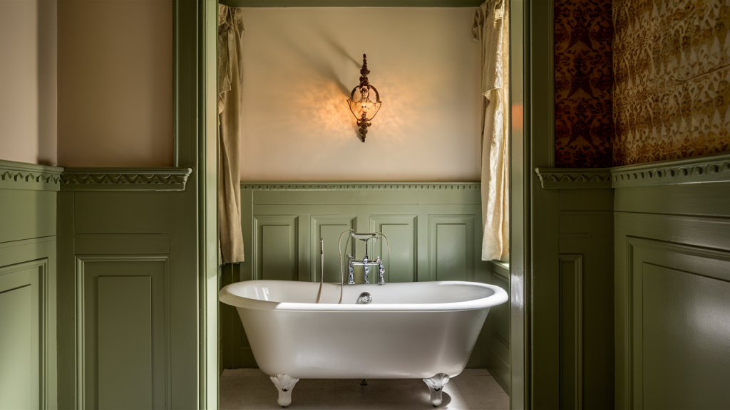 Victorian bathrooms often featured wainscoting or full-height paneling, adding both visual depth and practical protection. Painted in soft creams or pastels, the vertical lines and raised trim gave the room a refined architectural presence. This classic millwork wrapped the space in cozy elegance, softening the crispness of tile and porcelain with its inviting warmth. Today, it evokes a period elegance that instantly elevates any classic-inspired space.