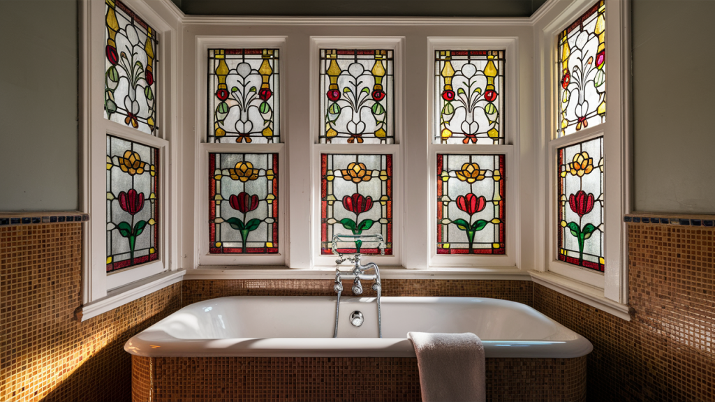Stained glass windows brought color and artistry into vintage bathrooms while ensuring privacy. Often depicting floral or geometric patterns, these handcrafted panes filtered light in soft, dappled hues, turning morning routines into serene moments. Whether used in small transoms or larger focal windows, stained glass served as a practical yet poetic feature that added richness, personality, and old-world charm.