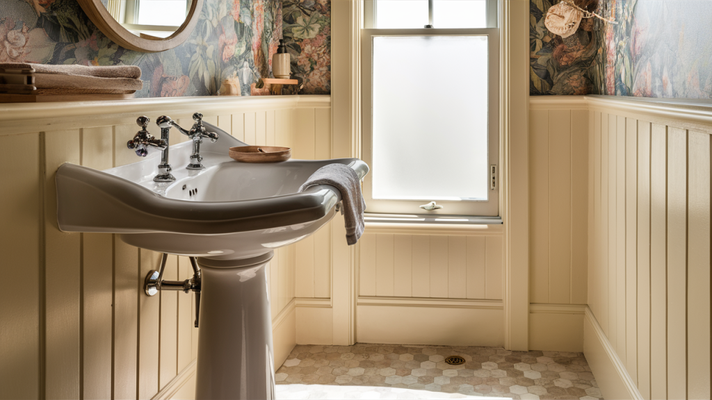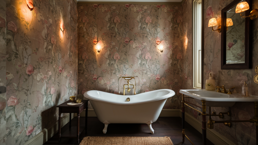Floral wallpaper brought softness and personality to vintage bathrooms, often featuring delicate roses, vines, or garden scenes in muted tones. These patterns wrapped the space in a cozy, romantic atmosphere, lending an intimate feel to even the smallest powder rooms. Whether in faded pastels or bold botanical prints, this decorative touch added charm and character, offering a gentle counterbalance to the harder surfaces of tile and porcelain.
