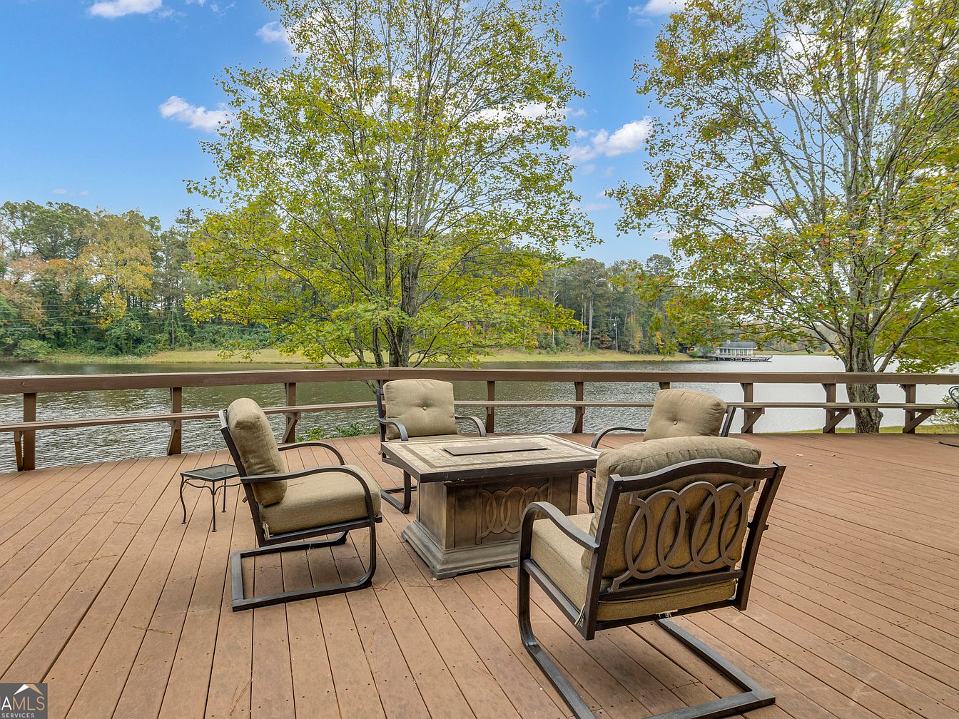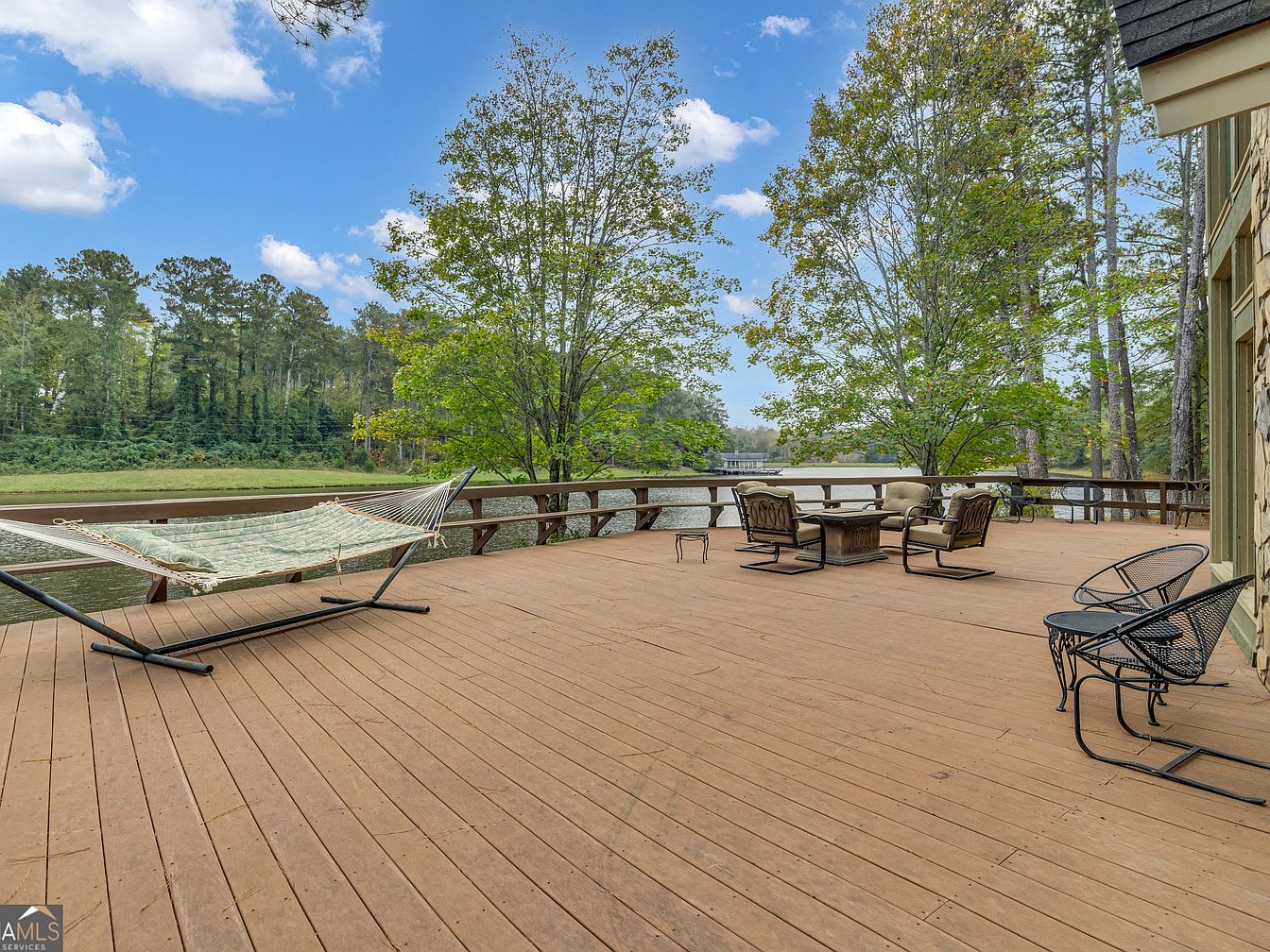 Spacious wooden deck with a serene view of a large lake, bordered by mature trees providing natural shade and privacy. The deck features ample open space for gatherings, with a sturdy railing ensuring safety for children and pets. A comfortable hammock is set up for relaxing, while a cozy outdoor seating arrangement with cushioned chairs and a coffee table invites family conversation or evening s’mores. Additional wrought-iron chairs and a small table offer extra seating or a quiet spot for morning coffee. The warm, natural wood tones of the deck blend harmoniously with the lush, green landscape and tranquil water beyond.