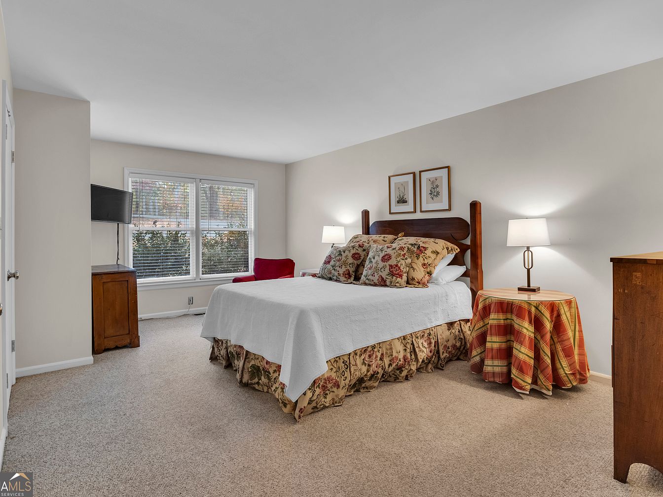 This spacious, warmly lit bedroom features a large window that bathes the room in natural light, perfect for a family-friendly atmosphere. The plush beige carpet adds comfort for everyday living, while the walls are painted a soft, inviting shade. A wooden bed with floral bedding and decorative pillows is the focal point, complemented by matching floral art above. Two nightstands, one draped in a cheerful plaid tablecloth and the other traditionally wooden, both hold modern lamps for balanced illumination. A cozy red chair by the window invites relaxation or story time, creating a welcoming and restful family space.