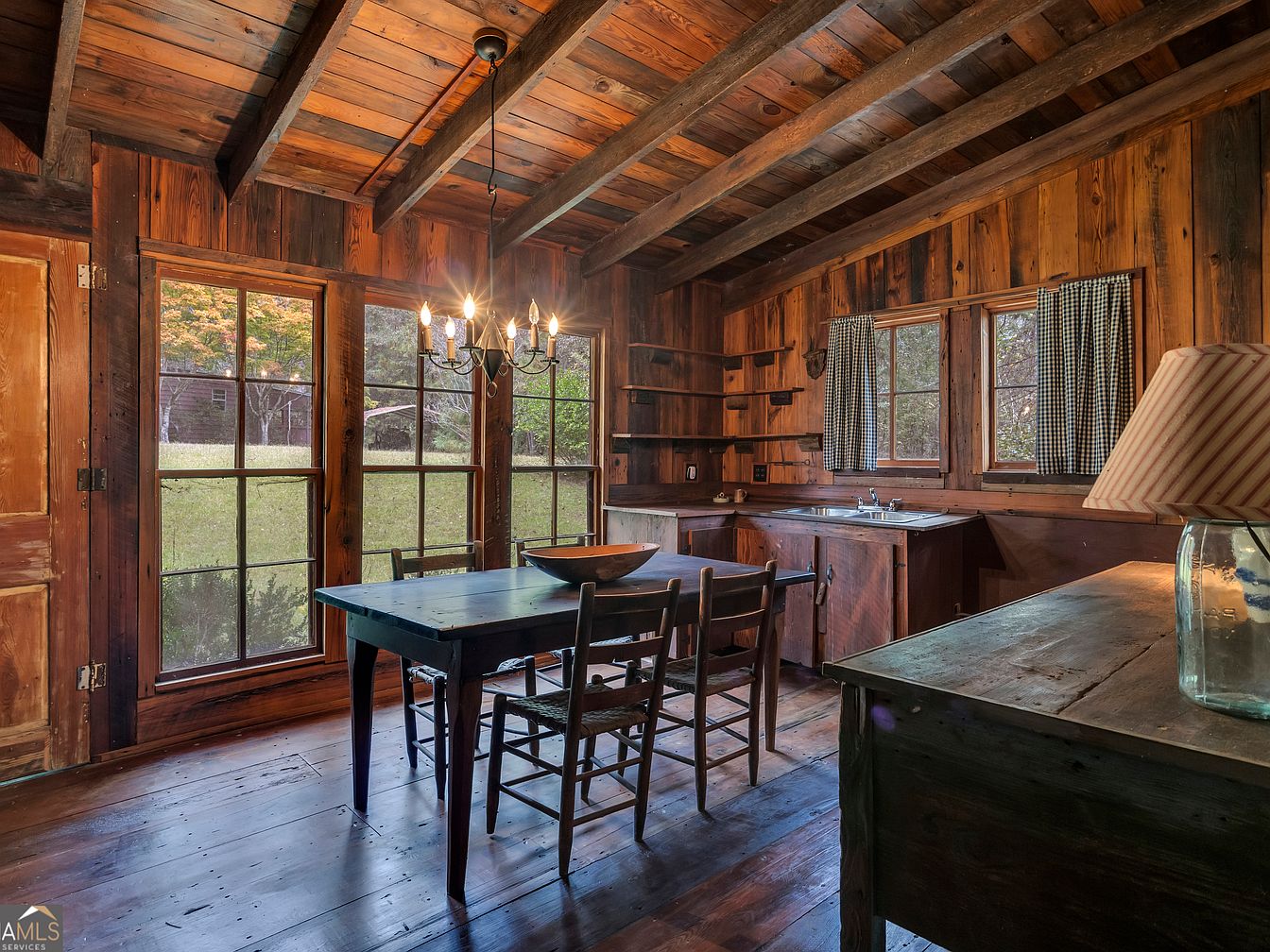 Warm and welcoming, this open dining kitchen is accented with rich, natural wood covering the floors, walls, ceiling, and beams, creating a cozy rustic ambiance. Large windows fill the space with sunlight and offer scenic views of the green yard, perfect for watching children play while preparing meals. The room features a simple wooden dining table with four chairs, ideal for family gatherings, and a spacious sideboard with a charming glass lamp. Shelves above the wooden cabinetry provide practical storage, while dark checkered curtains add a homey, country style to this communal space designed for comfort and family connection.