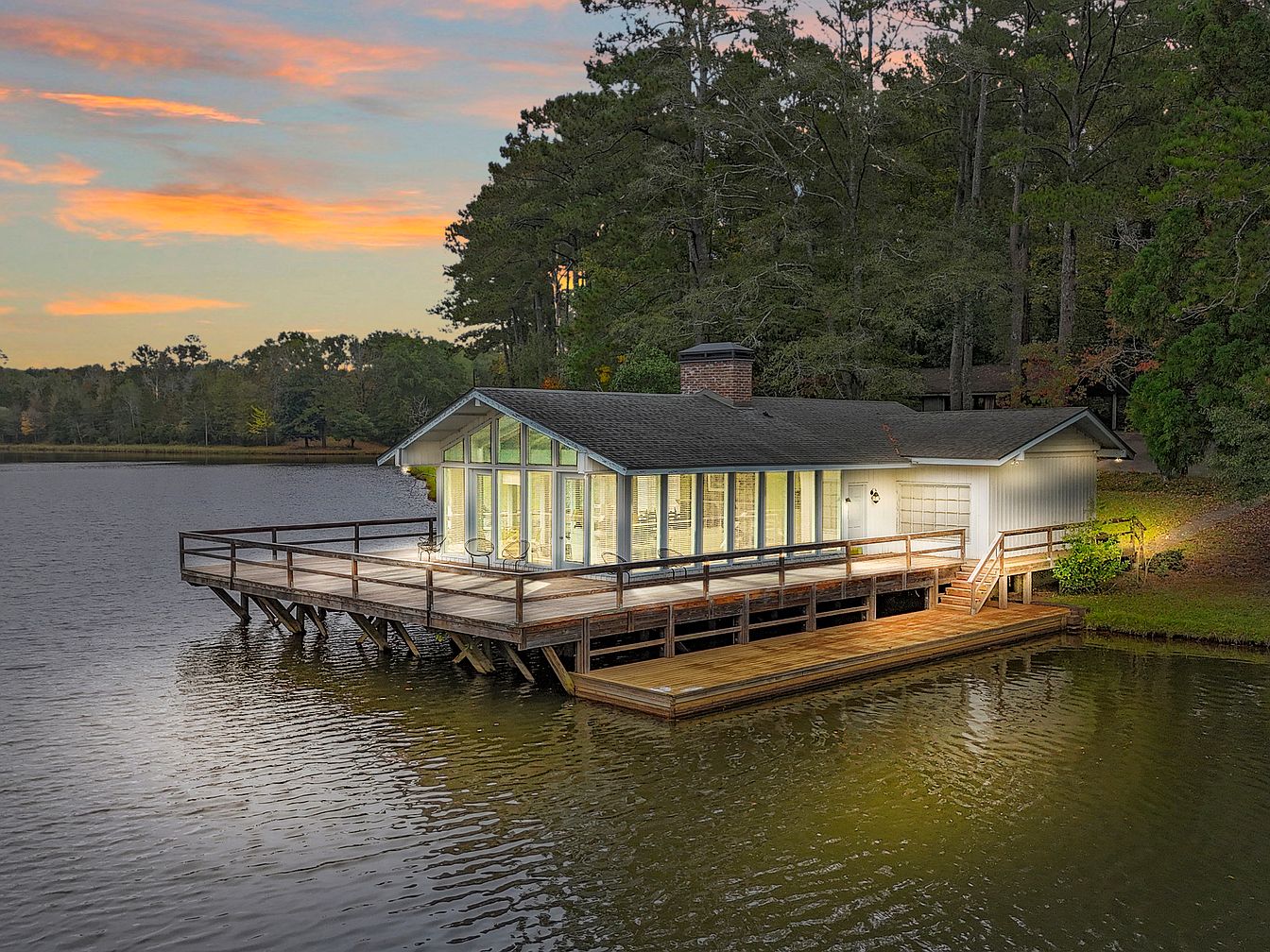 A beautiful wooden deck extends over calm lake waters, wrapping around a charming single-level home with large glass windows that offer expansive lake views. The deck is spacious, providing ample room for family gatherings, safe enclosed play, and outdoor dining. Soft, warm lighting around the home creates a welcoming atmosphere at sunset, while the surrounding forest adds peaceful privacy. The home’s exterior features neutral tones with a blend of modern and rustic design elements. Sturdy railings border the deck for child safety, and easy access is provided by gentle steps leading to the grassy shoreline, making it ideal for family living.