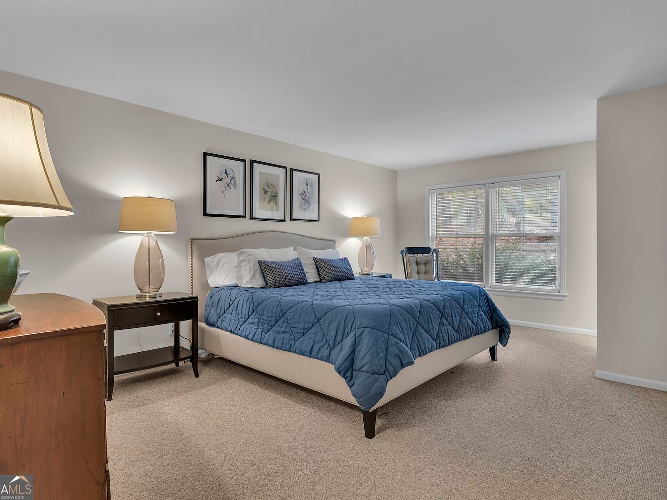 A spacious and inviting master bedroom features a large window that fills the space with natural light, creating a warm and welcoming atmosphere for families. The room is centered around a comfortable upholstered bed dressed in a deep blue comforter with patterned accent pillows, providing a calming touch. Soft beige carpeting runs wall-to-wall, making the room perfect for children to play. On either side of the bed sit matching nightstands topped with classic lamps for a cozy ambiance. Above the bed, three elegant framed botanical prints add sophistication. Neutral walls and classic furniture choices create a timeless, family-friendly space.
