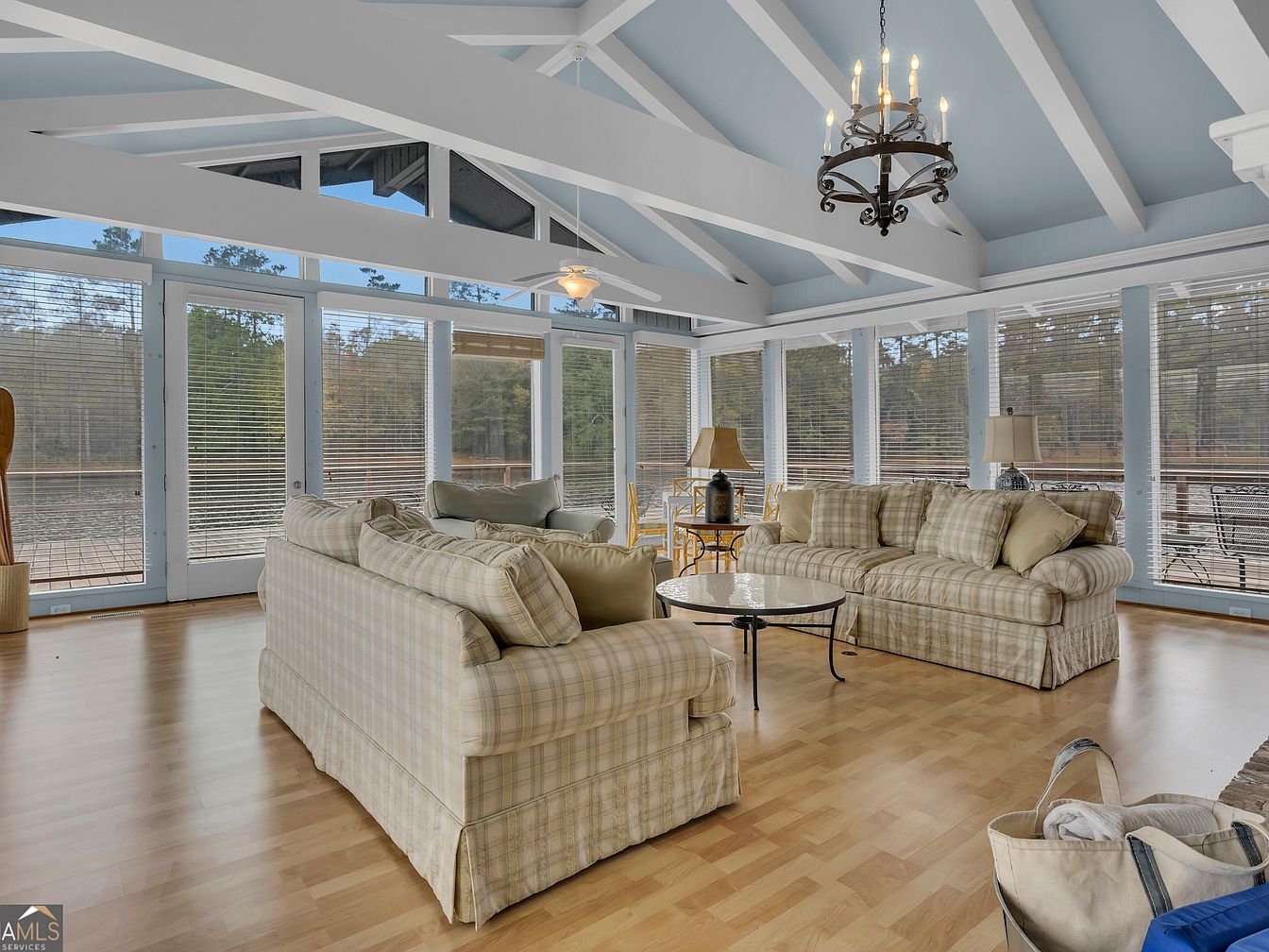 A spacious sunroom with vaulted ceilings painted sky blue and accented by white exposed beams creates an airy, inviting atmosphere perfect for family gatherings. The room features wall-to-wall windows and glass doors, letting in abundant natural light and offering serene views of the wooded outdoors. Two large, plaid-upholstered sofas face a round coffee table in the center, while two table lamps and a rustic iron chandelier add warm, ambient lighting. The light wood flooring is easy to clean, making it ideal for children and pets, while the open layout encourages relaxation, conversation, and play for the entire family.