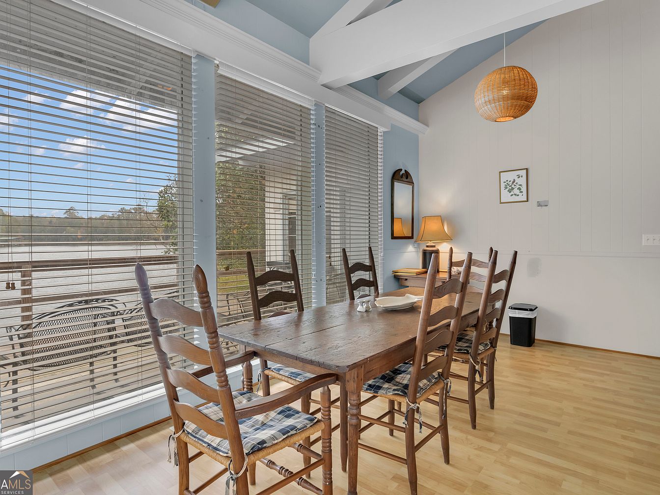 A warm, inviting dining area featuring a large wooden table with six high-back, ladder-style chairs, each adorned with plaid cushions for comfort. The room is illuminated by natural sunlight pouring through a wall of expansive windows, offering serene views of the outdoors and access to a wooden deck for family gatherings. High, white-beamed ceilings create an airy, open atmosphere. Soft pastel blue walls complement the light hardwood flooring and bring a tranquil, family-friendly vibe. Added touches include a woven pendant light, a small lamp atop a writing desk, a decorative mirror, and art, making the space cozy and welcoming for shared meals.